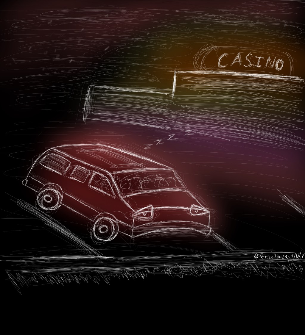 We ate our pizza, a most delicious and invigorating meal, and then climbed back in our poor, overloaded, overworked Subaru and drove to the Casino on the edge of town. We signed up for their “players reward” program, got our car registered with security, and were sent over to a corner of the parking lot, where we moved all of our luggage to the front seat, climbed on to the platform bed, and finally went to sleep.