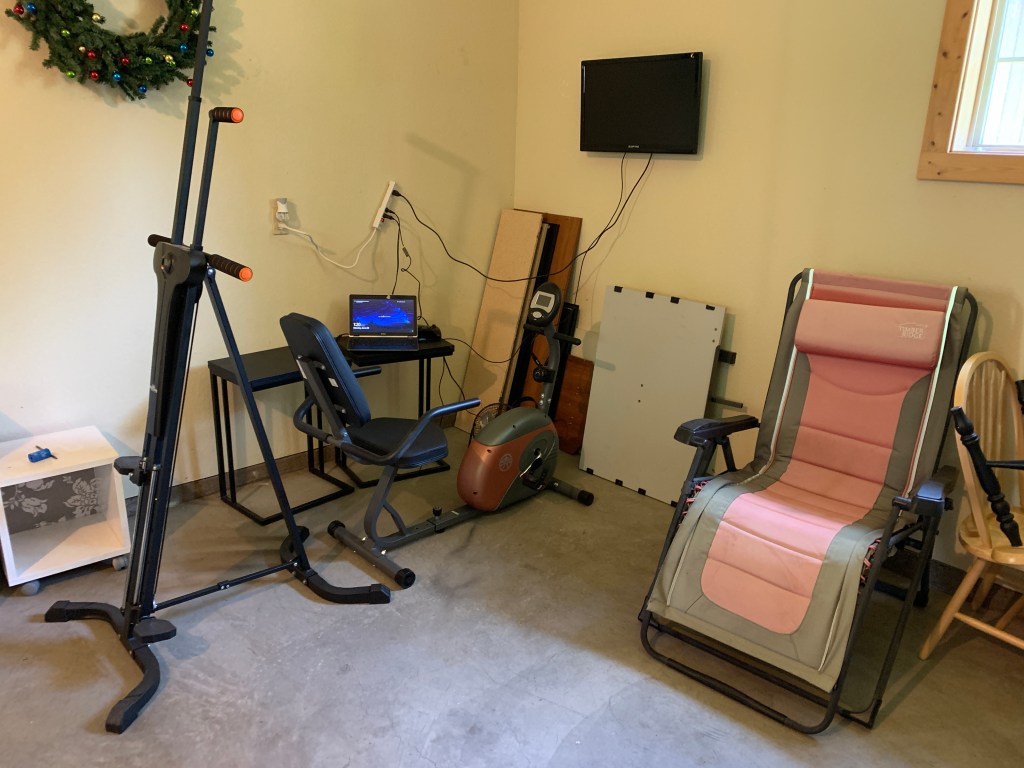 Now, on to the productive stuff! Our house originally came in to the family as a place for my dad to stay a few days a week to be closer to work, then I started staying here for the same reason a few days a week, and now my wife and I are here full time while my dad is still doing the few days a week thing. When I started coming down over a year ago, the garage was a bit disorganized and a bit dirty. Since then, the garage has gotten way less organized and way, way dirtier. This weekend, knowing that my wife was out of town, I completely gutted the thing. It took over ten hours, but I got things way more organized, took out a bunch of trash, swept out an upsetting amount of dirt and dust and dead bugs, and even got a little exercise area set up with my new exercise bike and a monitor to play games on.