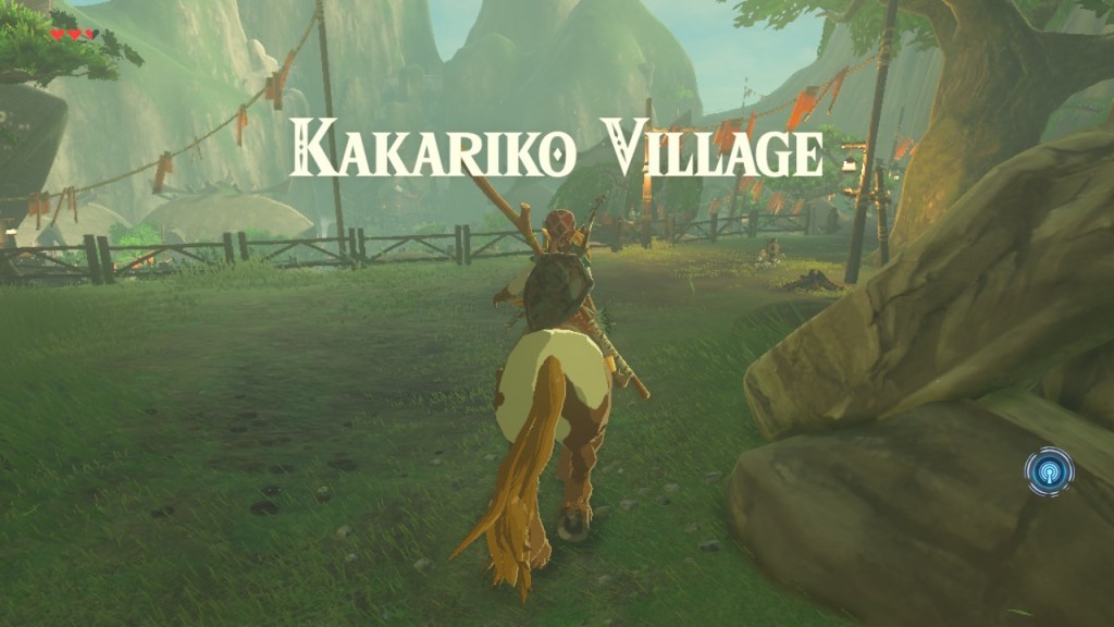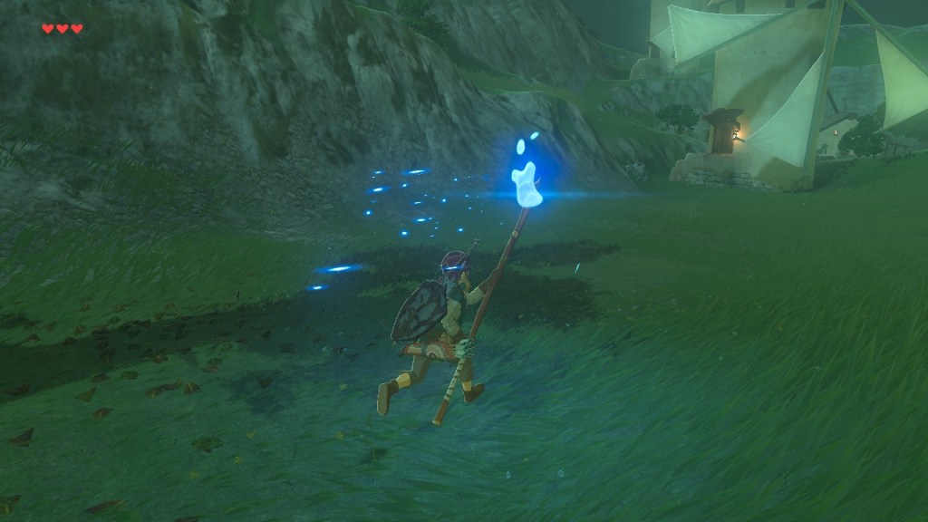 Having a new horse comapnion and championship status, I set off to the East again. I ended up drifting off the path to get another tower here, then made my way into the village. Having been here several times, I knew I couldn’t upgrade my Shiekah Slate without first lighting the furnace, so I lit up a spear with blue flames and set the fires ablaze.